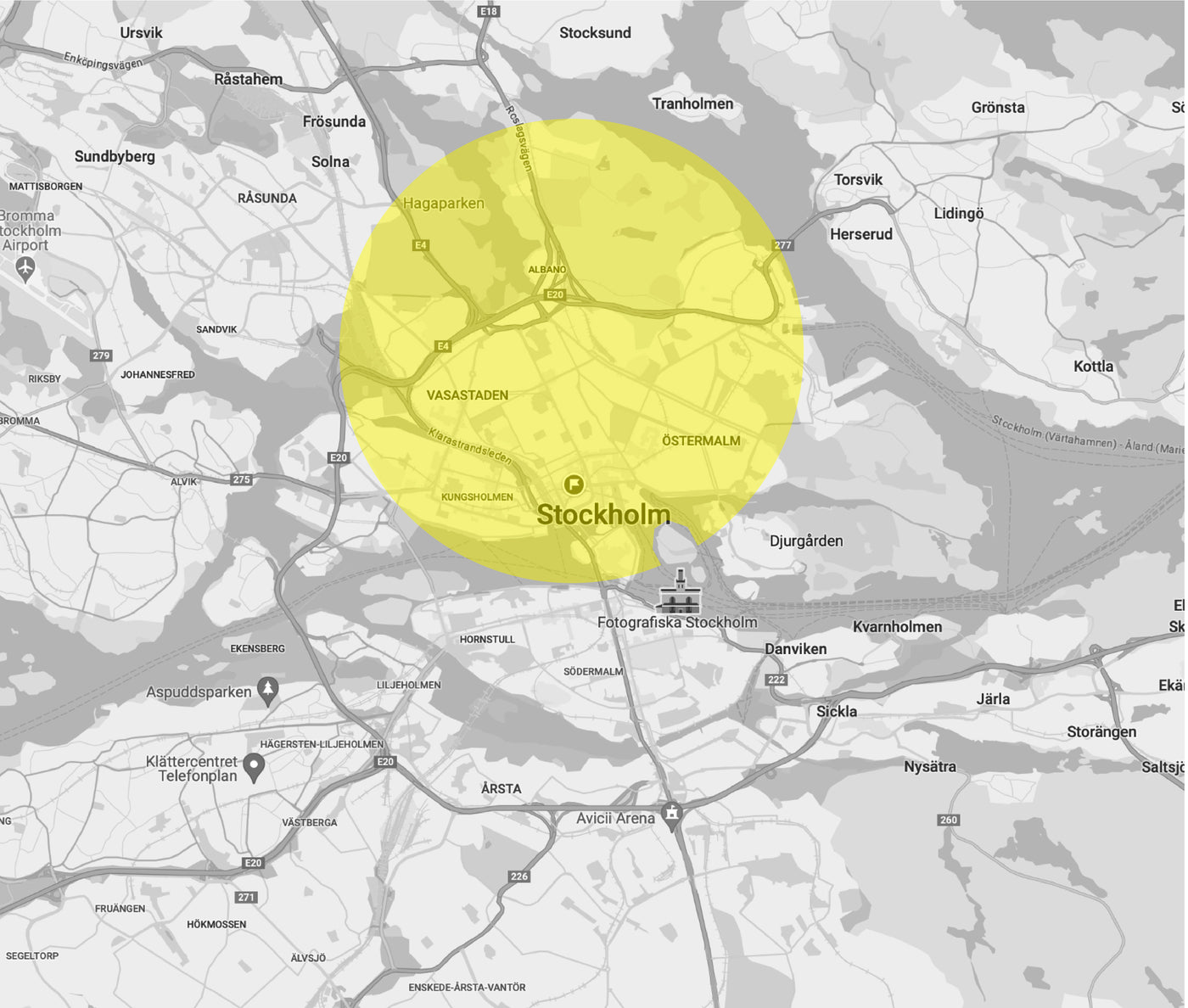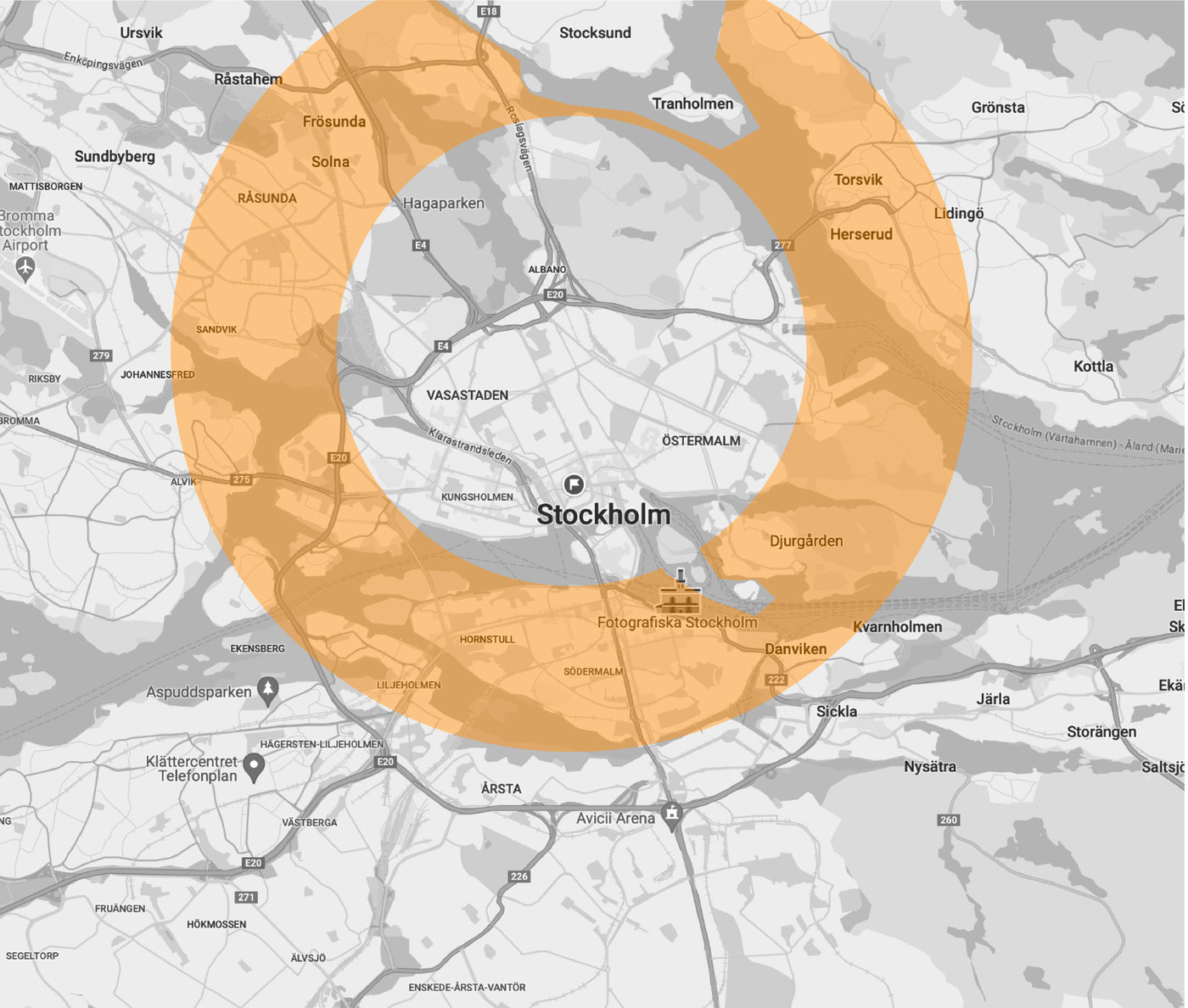 Vår hub ligger i Vasastaden. Allt inom den gula zonen faller i i den billigaste utkörningskostnaden.